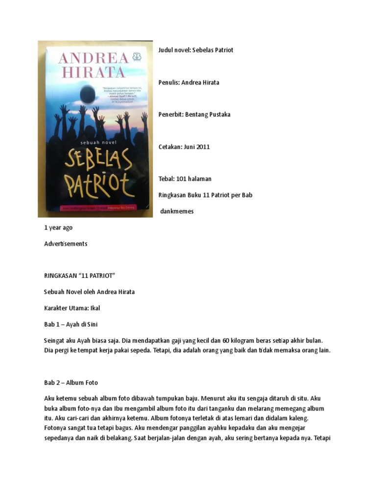 Ringkasan novel sebelas patriot. Novel Sebelas Patriot adalah karya yang unik karena untuk mendapatkan seluruh impresi secara utuh dari karya ini mesti pula mendengarkan tiga buah lagu yang lirik dan aransemen musiknya diciptakan oleh Andrea Hirata. Yang dia ingat tentang ayahnya adalah berikut ini. Jenis penelitian ini adalah deskriptif kualitatif.